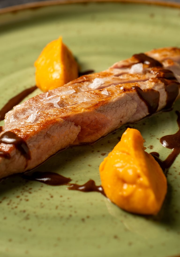 Txerri solomoa ondo frijitua, kantharellus gisatuarekin, trufa olioarekin eta 65º-tan prestatutako arrautzarekin.